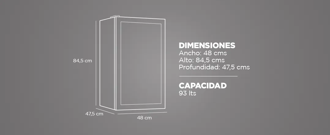 $129.990El precio original era: $129.990.$99.990El precio actual es: $99.990.Agregar al carritoSin embalajeCon embalaje Altura Ancho Profundidad Peso Especificaciones Niveles de Temperatura 1~10 Capacidad Total 93 LTS Sistema de Enfriamiento Frío Directo Capacidad Freezer Capacidad Refrigerador 93 LTS Motor Inverter No Dispensador y/o Ice Maker No Termostato Mecánico Dimensiones nicho Alto (cm): 85 Ancho (cm): 51 Largo (cm): 46 Peso (kg): 20.4 Iluminación No Reseñas