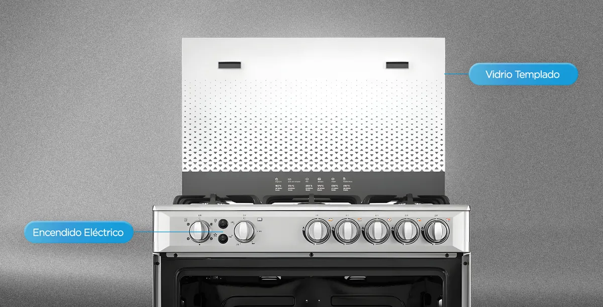 Vidrio templado para mayor protección y mantención de tu cocina. Enciende la cocina de manera fácil y segura con su encendido eléctrico.
