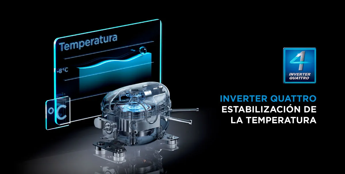 Ofrece refrigeración rápida, optimiza consumo energético y funcionamiento silencioso. Su tecnología estabiliza la temperatura y opera de forma constante.