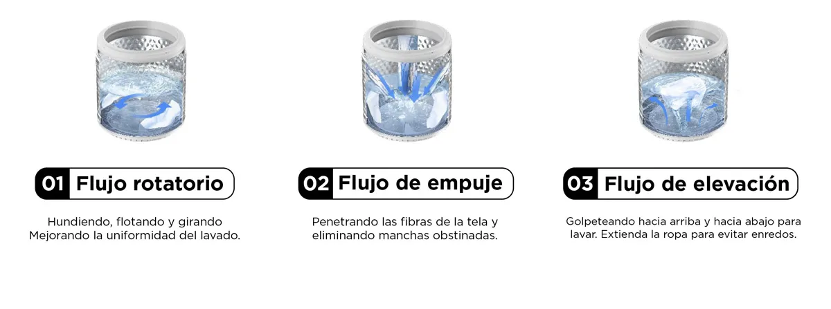 Tres caudales de agua poderosos eliminan eficazmente todas las manchas,
