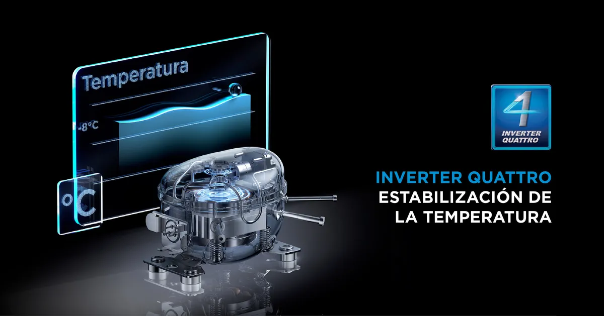 Ofrece refrigeración rápida, optimiza consumo energético y funcionamiento silenciosos. Su tecnología estabiliza la temperatura y opera de forma constante.